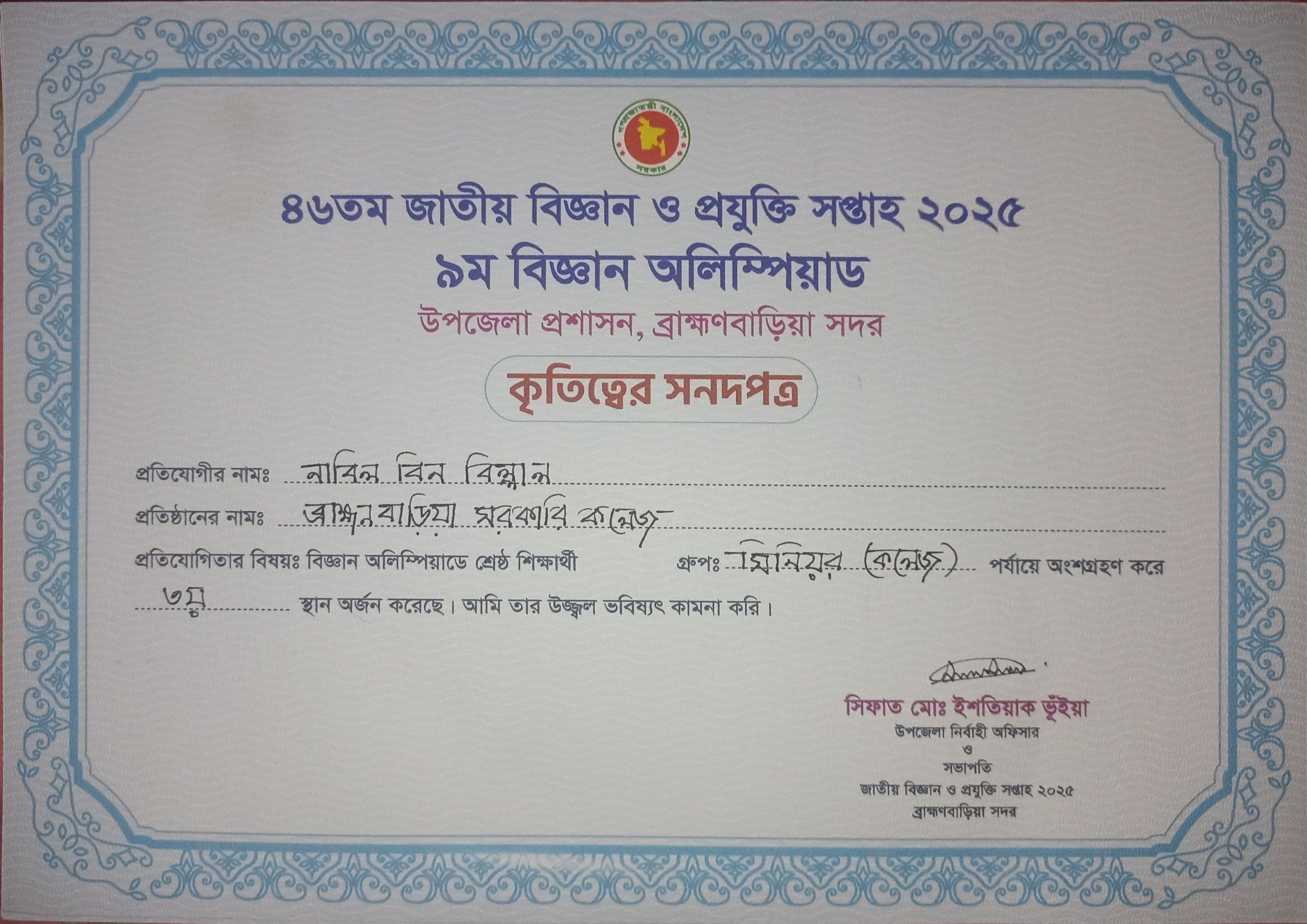 | 12:28, 3 May 2025 | Nabil-bin-billal-science-olympiad-crest-2025.jpg (file) | 647 KB | Crest awarded to Nabil Bin Billal for his exceptional performance in the National Science Olympiad 2025, symbolizing national recognition for scientific excellence and innovation. | 1 | |